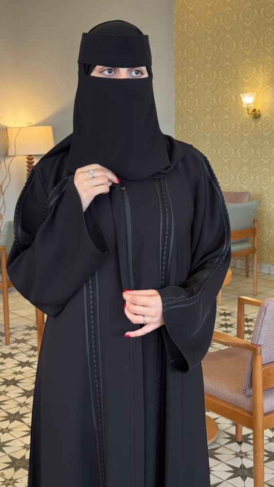 التصميم يزدان بخطوط طولية من الغيطان الأسود على كامل العباية لتمنحها لمسة كلاسيكية عصرية، تزيد من طول القامة وتعكس ذوقاً راقياً لا مثيل له.